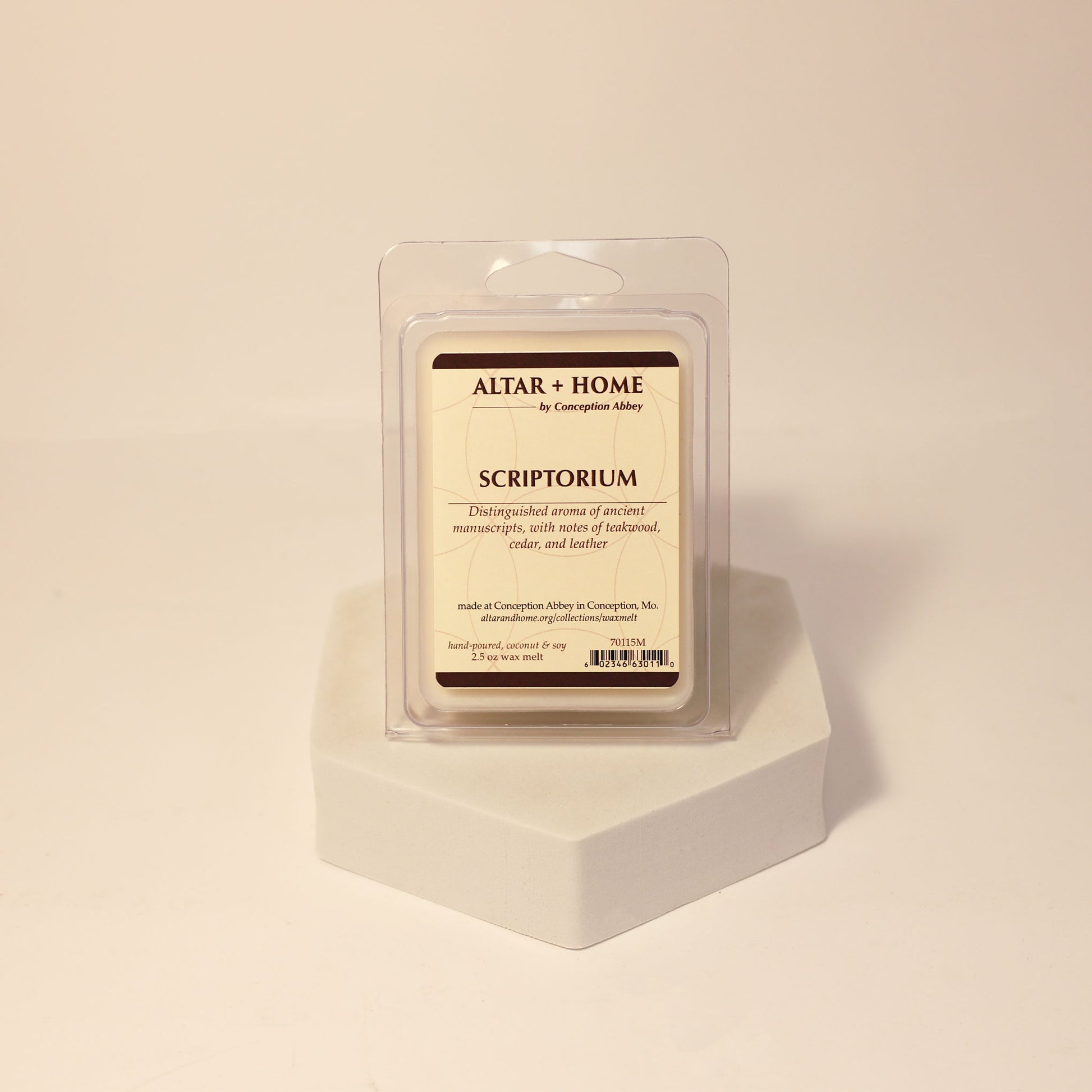 Hand-poured, coconut & soy wax. 2.5 oz (156 g). Made in the USA at Conception Abbey, Conception, MO.